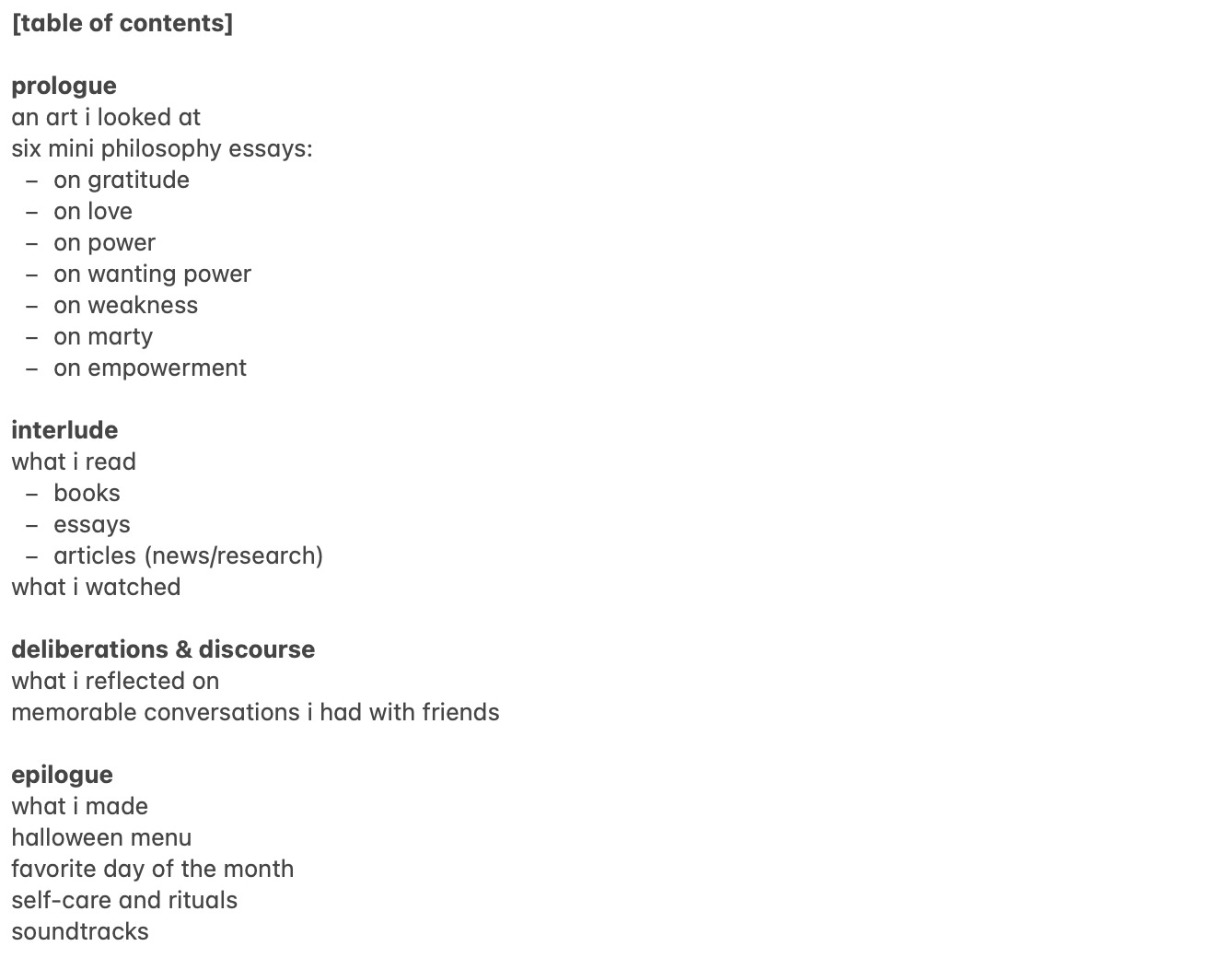 below, please find a tiny table of contents. i’ll include these whenever applicable, as i believe it’s an integral part of my academic work to convince you that i am, in fact, a serious philosopher.
