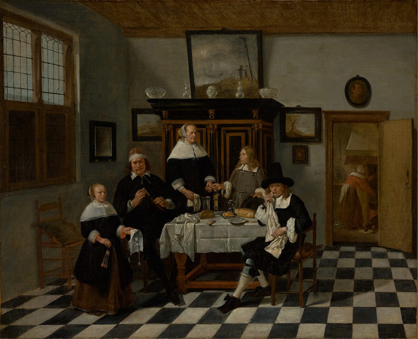 a respectable dutch family, freshly fed and spiritually primed for round two at church. the mother handing a prayer book to the younger child and the girl beside her clutcheing her starched cap and fan like a tiny puritan bureaucrat. it’s a tableau of domestic virtue that would make any calvinist beam. the longer you sit with the painting, the more it hums with quiet existential menace. look at the mise en abyme — paintings within paintings, art within more art. i count six in total. and on the mantel: five little decorative vessels. but then: right above the mantle, the large landscape of a ship at sea, a dark sky, a suspiciously theatrical shaft of light slicing through the gloom. disaster a mere storm away?