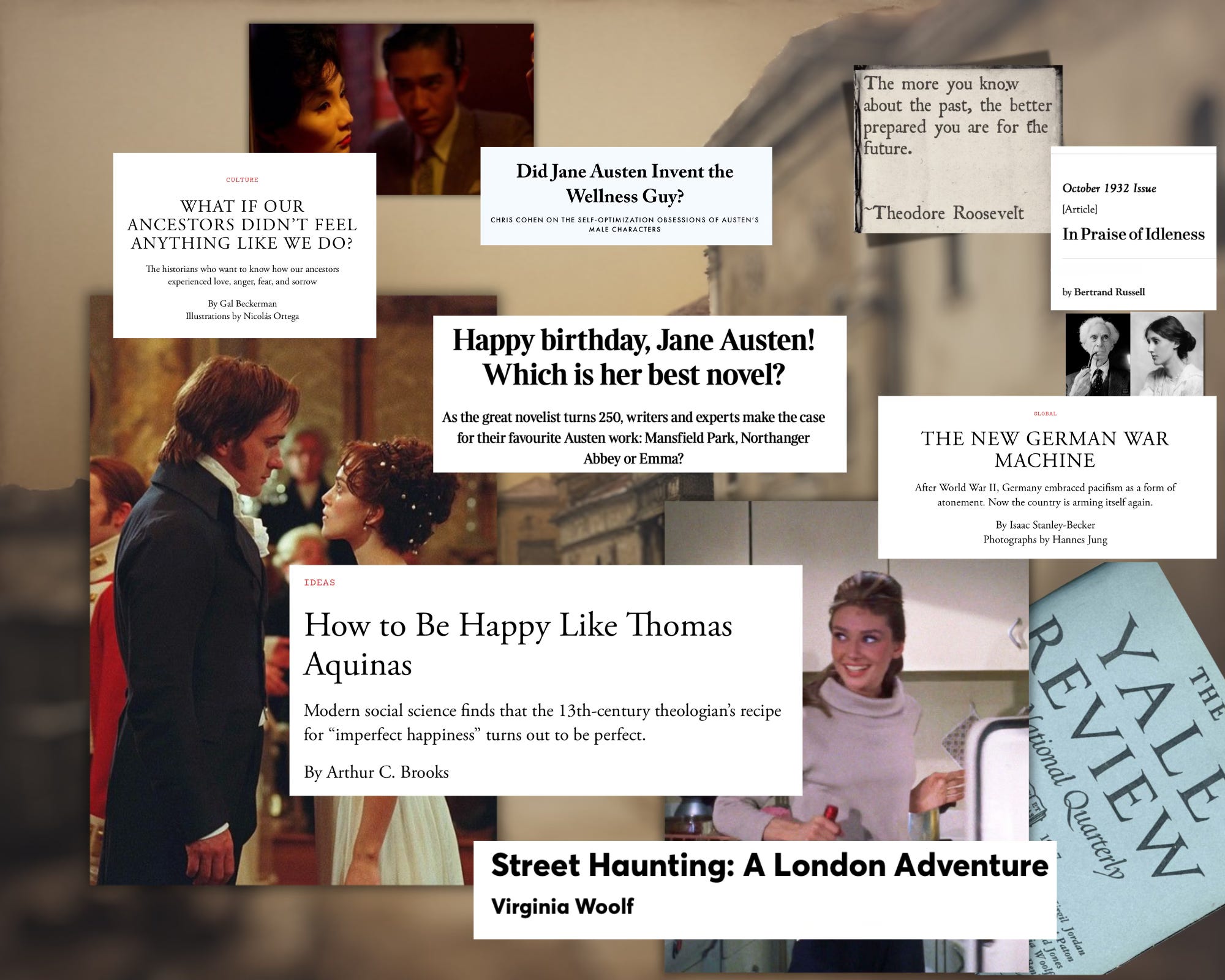 Germany’s uneasy return to military strength; Thomas Aquinas’s surprisingly modern theory of happiness; debates around Jane Austen — her greatest novel and what her satire of early “wellness” culture warns us about; revisiting Virginia Woolf through biography, diaries, and one of her best published essays at The Yale Review; on medieval symbolism; how our emotions differ from our ancestors; a fascinating piece on the political psychology of groups; critiques of abuse in classical music. Closing with classic defenses of idleness from Bertrand Russell and Virginia Woolf, questioning what we owe work, leisure, and the past.