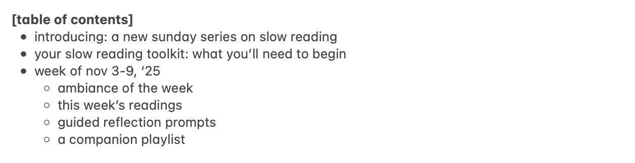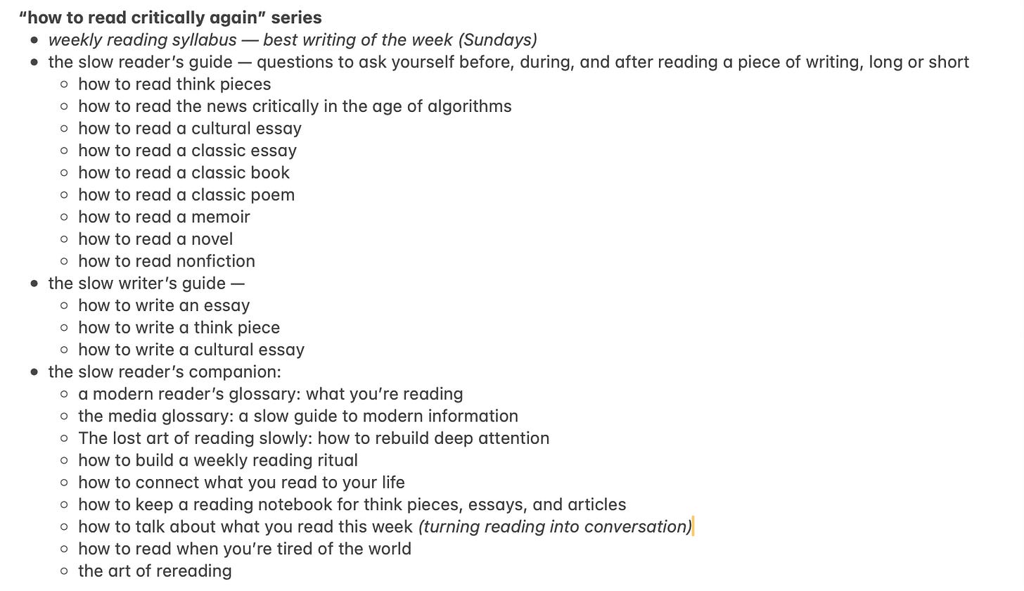 i’m starting a weekly slow reading syllabus for the month — a sunday series where i’ll share a curated list of the best pieces of writing i’ve read that week — alongside brief reflections on the spine of each argument so you can decide what to read and how to think with it.