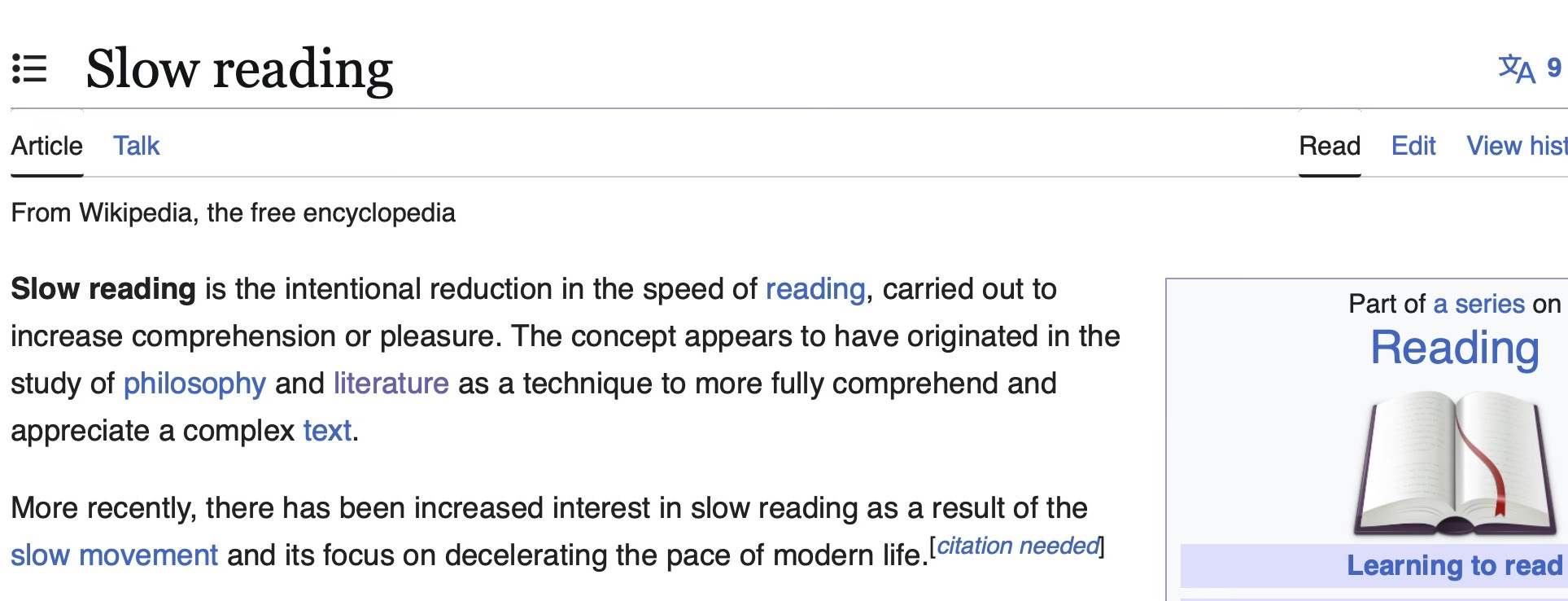 slow reading (v.) — reading slowly to savor language, understand more deeply, and think more clearly.